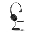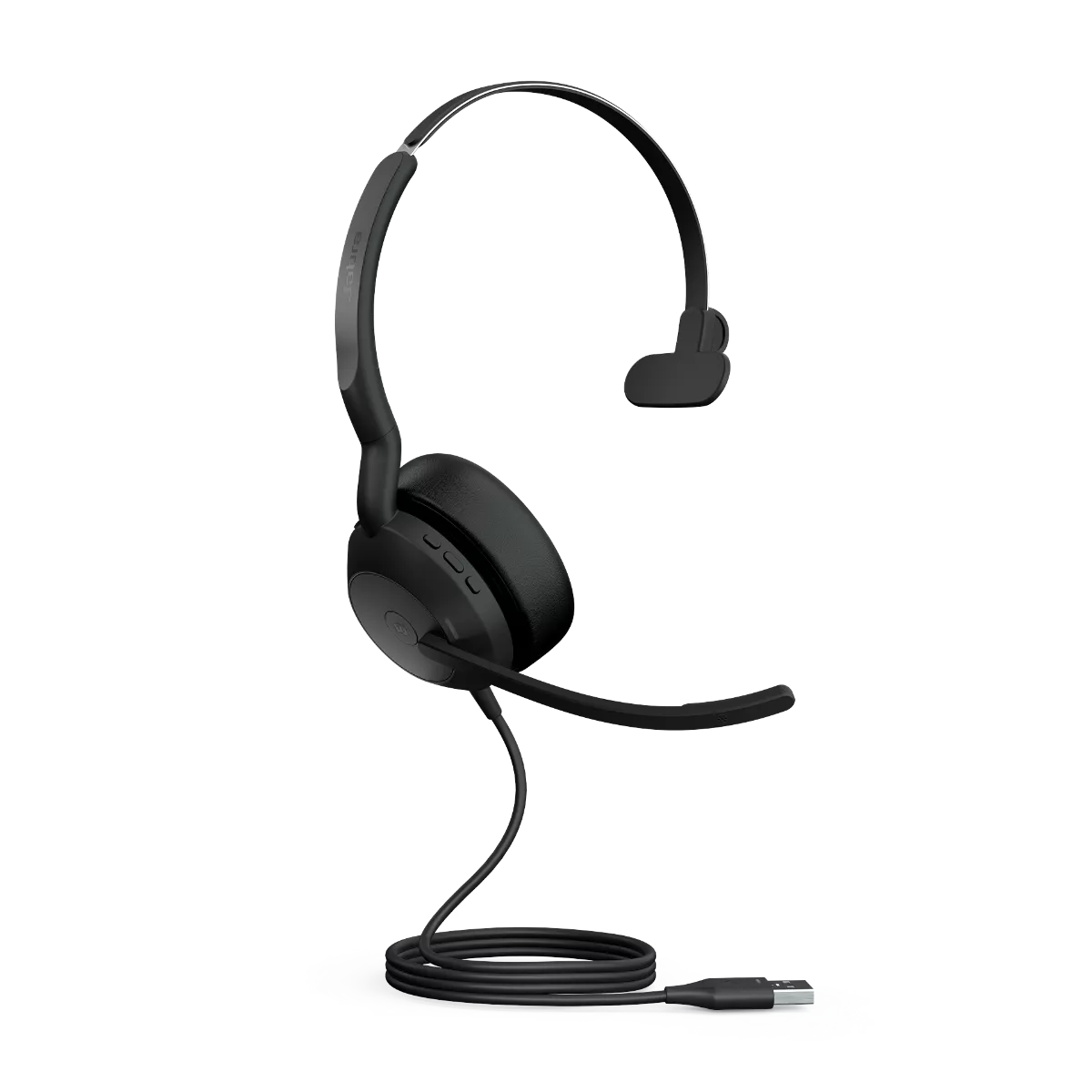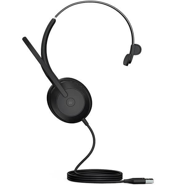 JABRA EVOLVE2 50 MS Mono. A professional wired headset designed for hybrid work environments. It features Jabra Air Comfort technology, incorporating layers of ultra-soft perforated foam in the cushioned headband and flexible, ergonomic earcup that rotates to move with you, ensuring exceptional comfort during extended use. The headset offers Active Noise Cancellation (ANC) to effectively silence your surroundings, allowing for uninterrupted focus. Equipped with noise-cancelling microphones, it ensures clear voice transmission during calls. The 28mm custom speaker delivers premium sound quality for both calls and media. The Evolve2 50 Mono is certified for leading virtual meeting platforms, facilitating seamless collaboration. Its integrated 360° busylight automatically illuminates during calls to signal your availability status. Additionally, the boom arm can be raised to mute calls quickly and lowered when you’re ready to speak. The headset connects via USB-A or USB-C, providing a reliable and stable connection during calls and meetings.